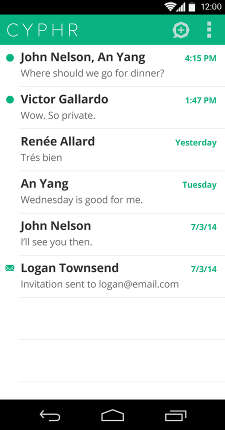 Cyphr, Android ve iOS için ücretsiz, kullanımı kolay, şifrelenmiş bir mesajlaşma uygulamasıdır. Tüm mesajlar şifrelenmiş, özel ve %100 sizindir. Ücretsiz bir hesap oluşturun, herkese açık ve özel anahtar çiftlerinizi yaratın ve mesajlaşmaya başlayın.